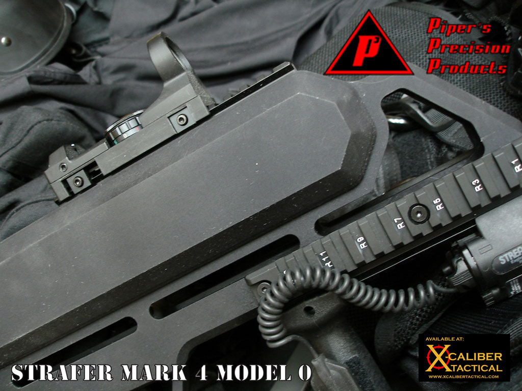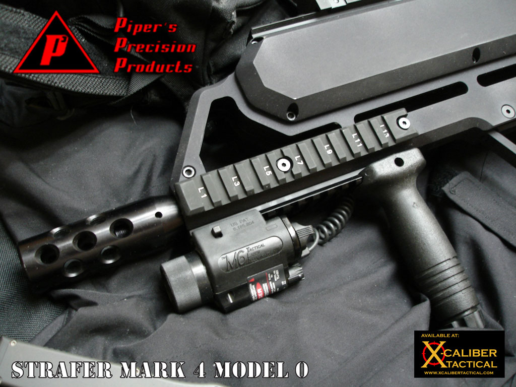 X-Caliber Tactical is proud to announce they have the Strafer Mark 4 Model 0 now in stock and ready for immediate shipping. The Strafer Mark 4 Model 0 is the best Strafer yet and is an evolution of the classic original. It has not only met the design goals of Strafer and M-134A2 Vulcan Minigun creator Paul Piper but has far exceeded it. This very well may be the world's fastest firing, if not the ultimate airgun in terms of firepower! The Strafer Mark 4 Model 0 is capable of rates of fire as high as 150-175 round per second or 9,000-10,500 rounds per minute! A larger diameter hopper cap allows for easier and faster reloading than previous original Mark 2 models and the extended improved hopper holds more BBs than any product to date - over 7,200 rounds in 6mm or an incredible 9,600 rounds in 4.5mm/.177! A DB Customs™ Tightbore barrel allows for greater range and accuracy over the original and effective accuracy on a human-sized target is 75 yards with a maximum range of 125 yards. The airgun is constructed of aircraft grade T6061 aluminum, allowing it to have a better ergonomically design over its Mark 2 predecessor such as a true pistol grip design with a traditional trigger placement, more compact shape and comfortable profile and better balance. The material construction and anodized finish gives it better structural soundness and durability from harsh environment and rough abusive use as is often experienced in law enforcement and military use. The Strafer carries a limited one year warranty. Optional hard points can be ordered at the time of purchase to permit the mounting of optional rails for accessories such as flashlights, lasers, vertical foregrips, sling mounts, and bipods and/or to mount an optional off-center scope mount for optical devices. This allow the Strafer to be customized to an infinite variety of mission requirements to fulfill the user's needs. The muzzle has 14mm negative or counter-clockwise threading for muzzle accessory attachment and an optional limited edition flash hider is also available which slides over the muzzle assembly and doubles to protect the threads from damage or wear. The muzzle assembly can also be removed and re-installed backwards into the weapon to protect the threading also. And for the first time there is also a safety button and available soon as a user installed option, a unique setting that bleeds off the air flow to reduce muzzle velocity by half without the need of switching air regulators. This permits the gun to be used safely at closer ranges upon a target where the full muzzle velocity may be more harmful. Warning: Some Strafer owners have asked about the use of High Pressure Air (HPA) in their CO2 tanks. HPA is a higher pressurized gas than CO2, and as such these tanks may malfunction, leak, develop cracks or even explode. X-Caliber Tactical DOES NOT in any way recommend the use of HPA with tanks that carry "CO2 ONLY" markings.